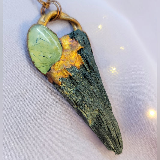 Black Kyanite & Prehnite Raven Electroformed Copper Necklace