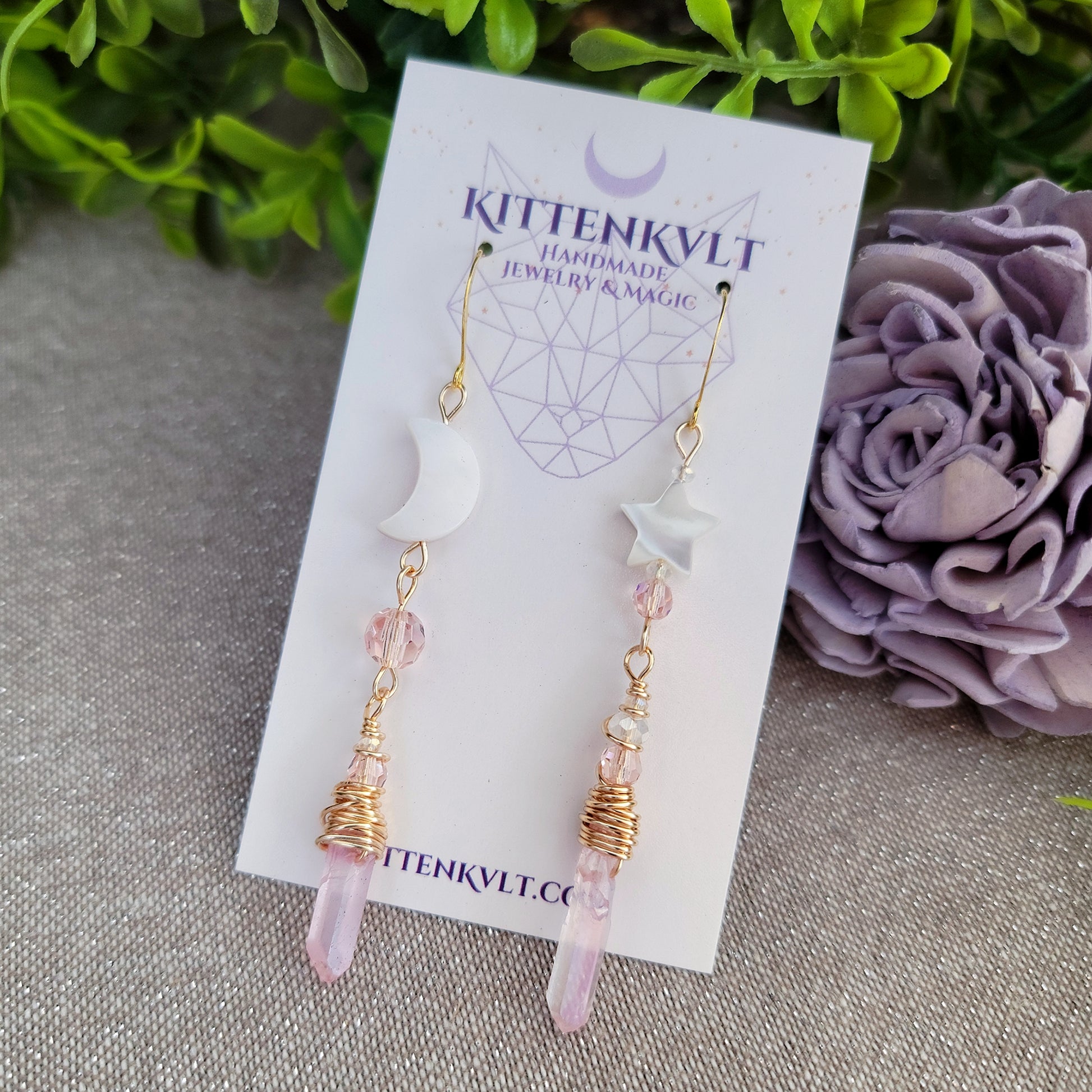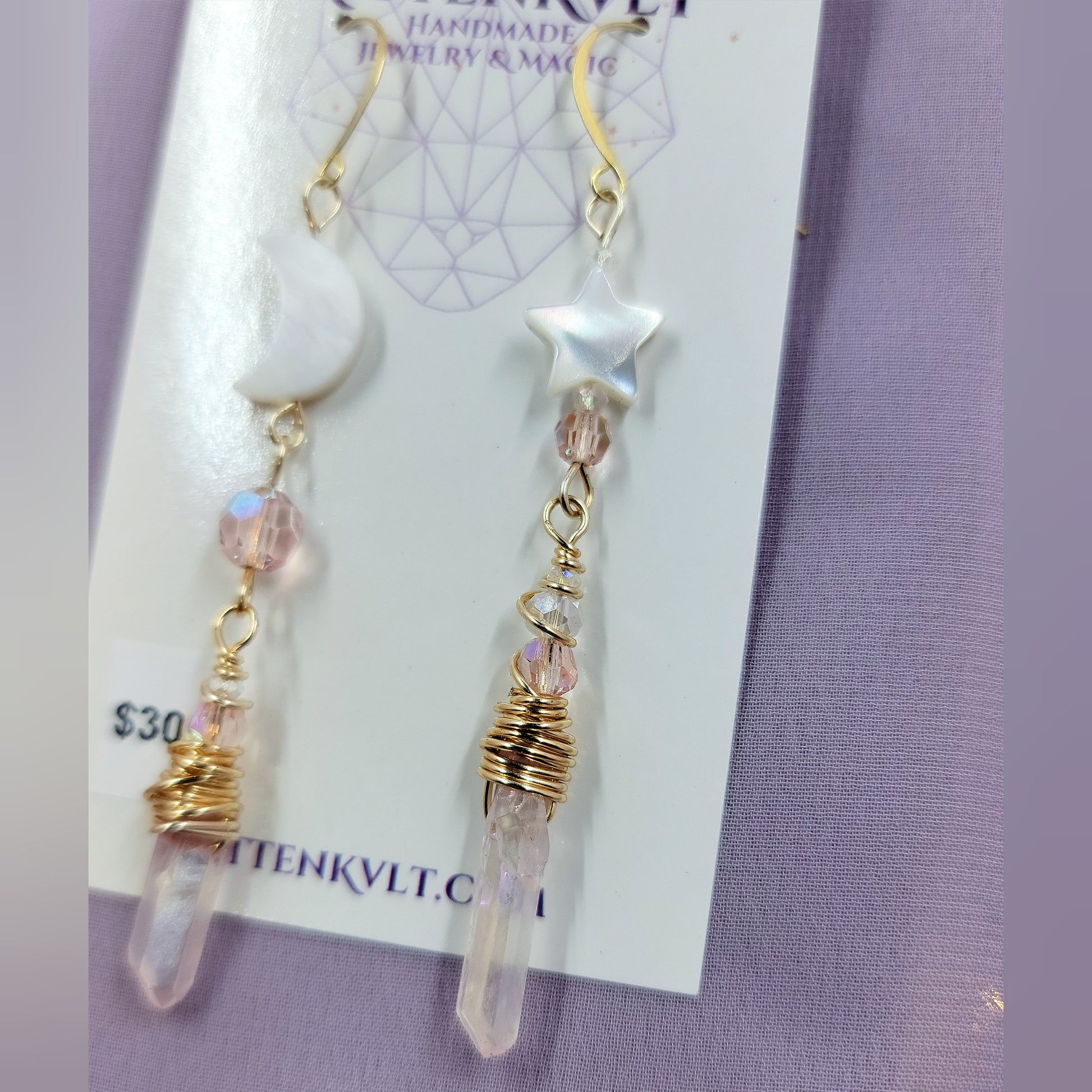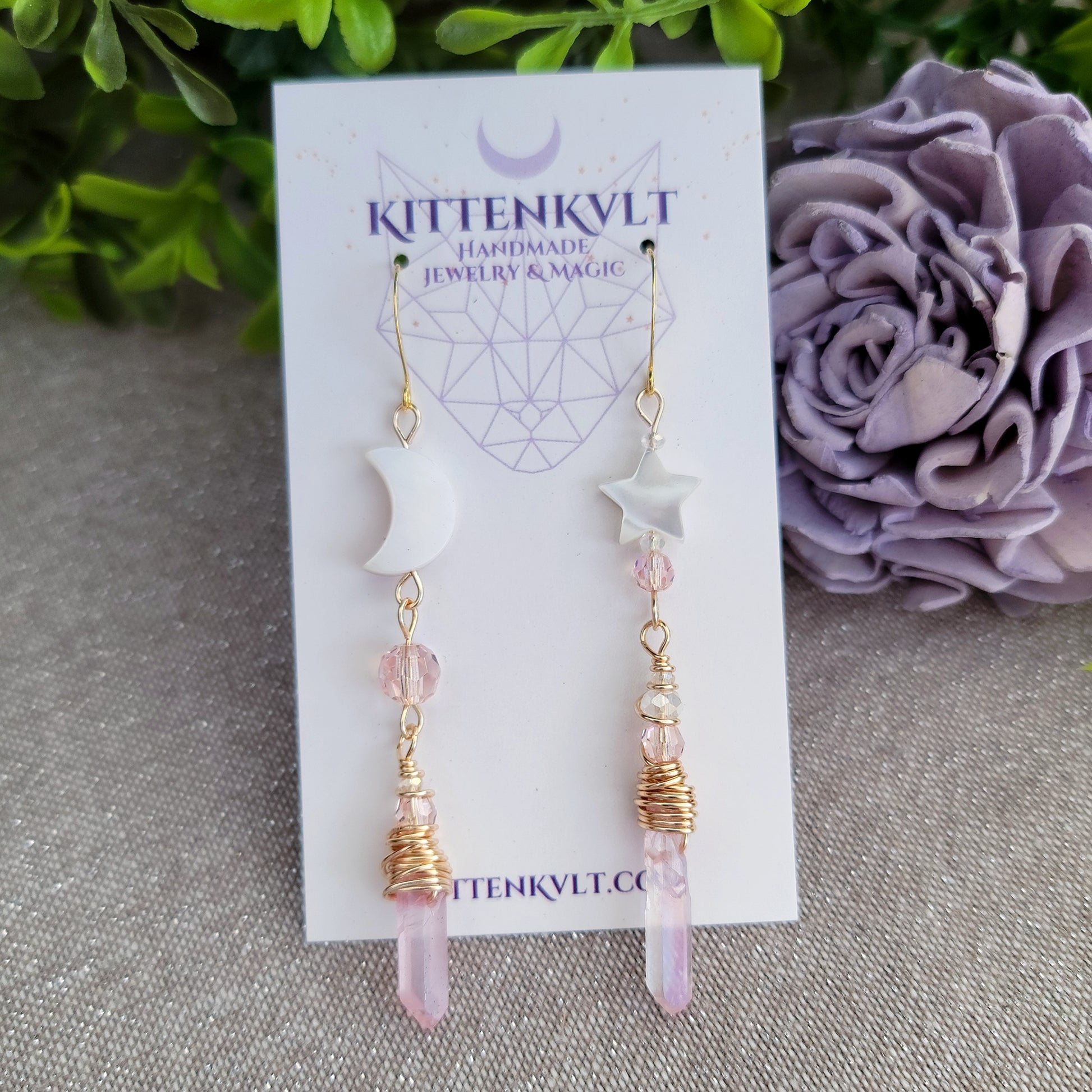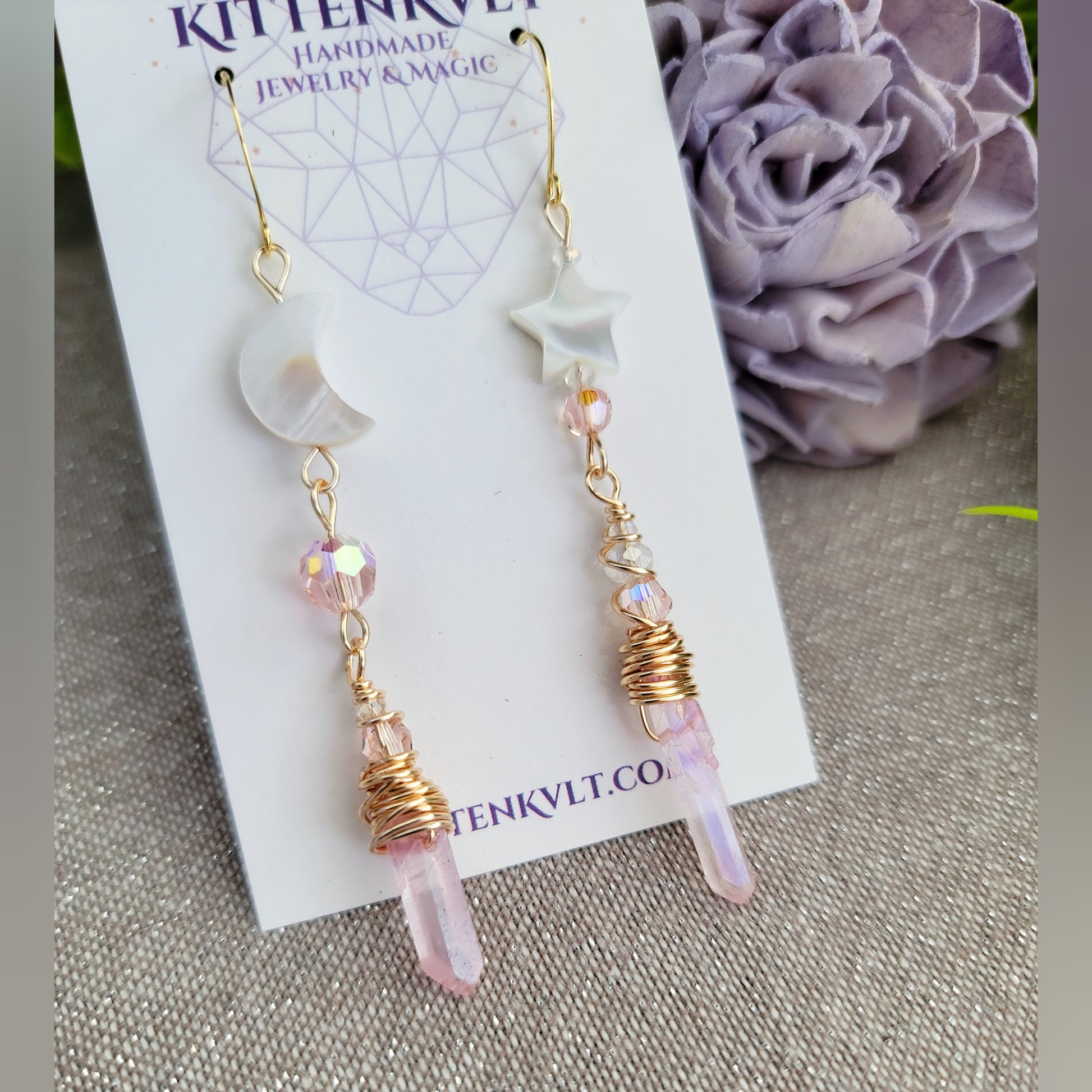 - pink aura quartz, mother of pearl shell & Czech Glass prism beads (pink aura quartz is clear quartz that has been dyed & heat treated to give the rainbow finish)