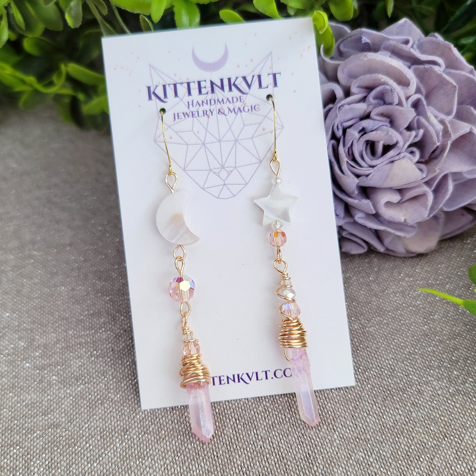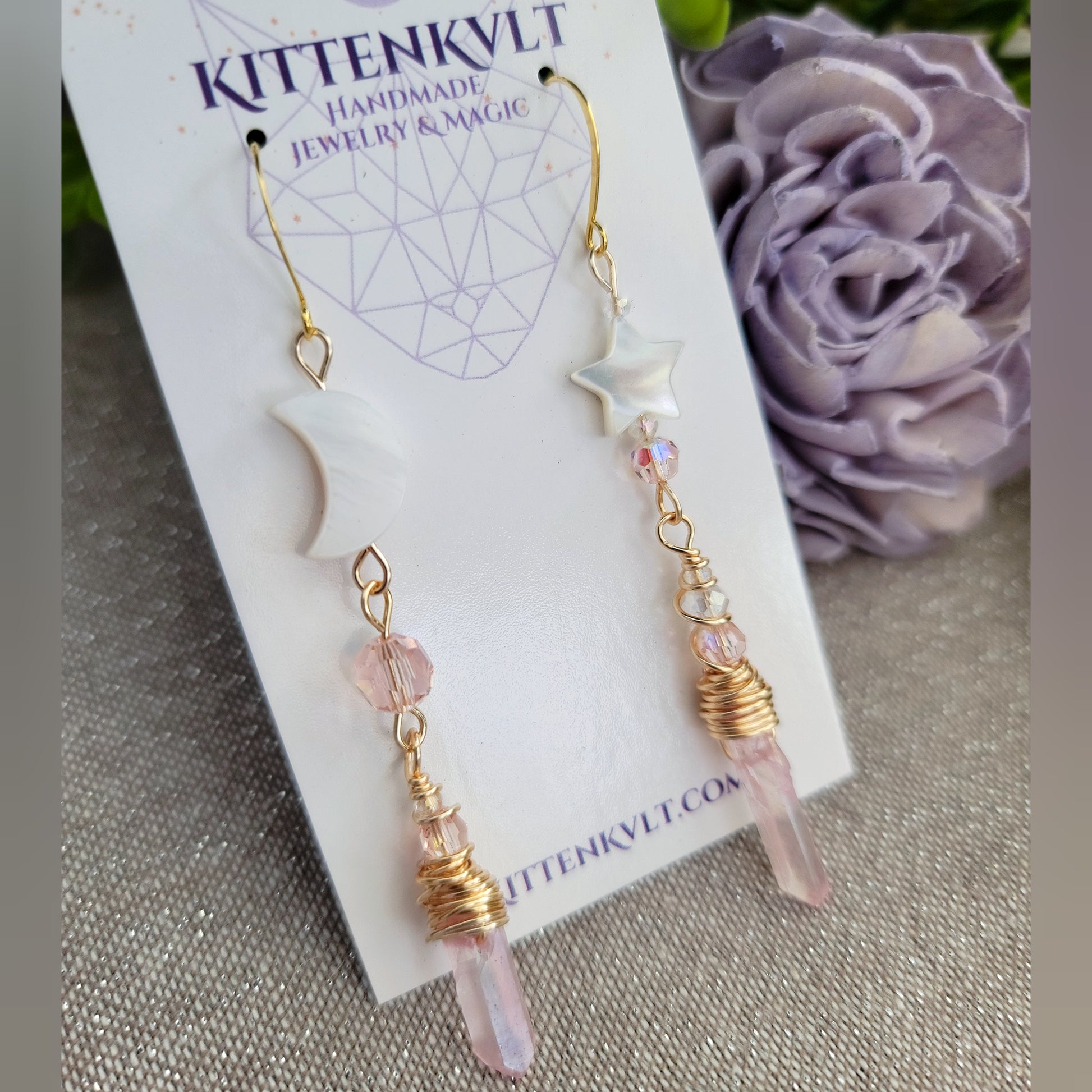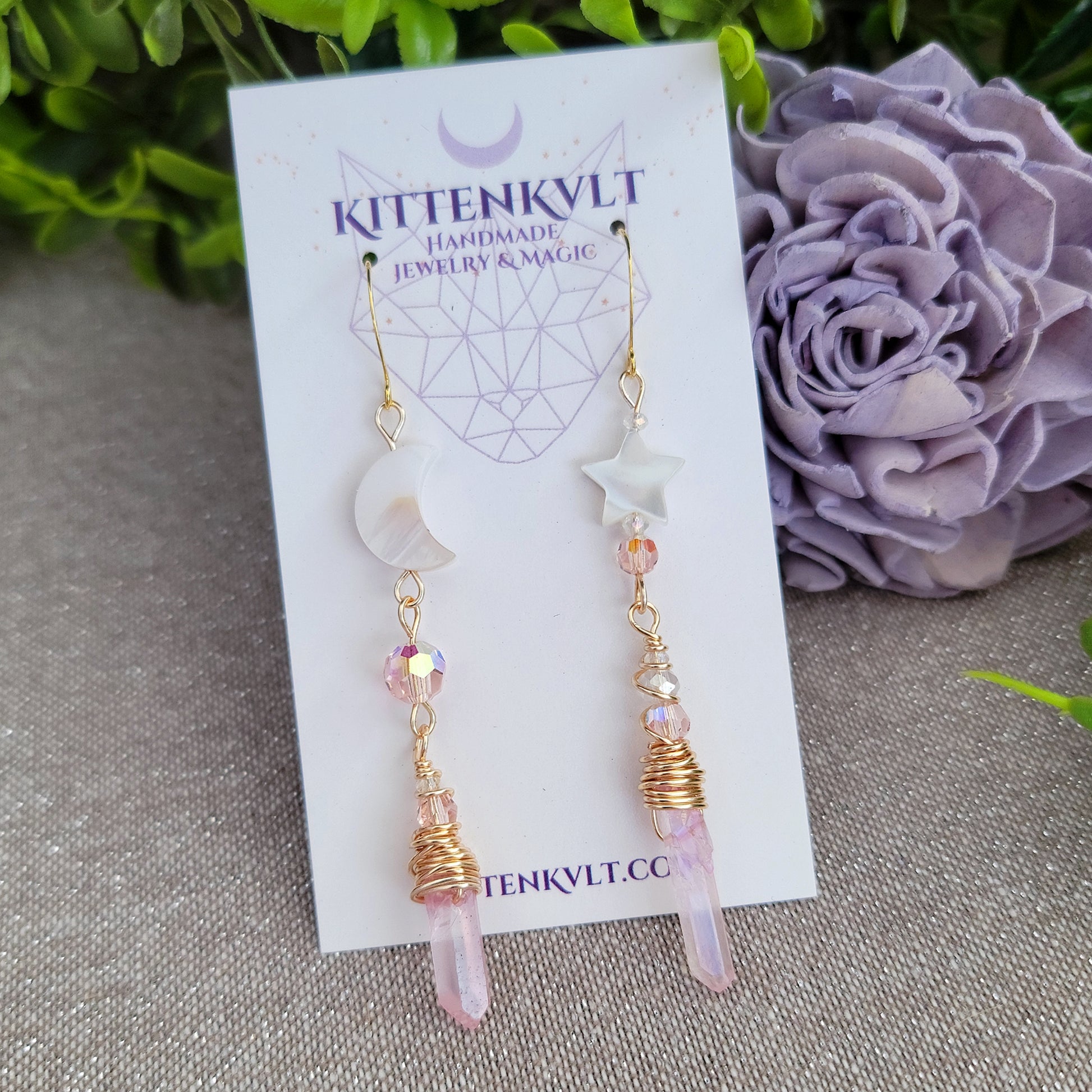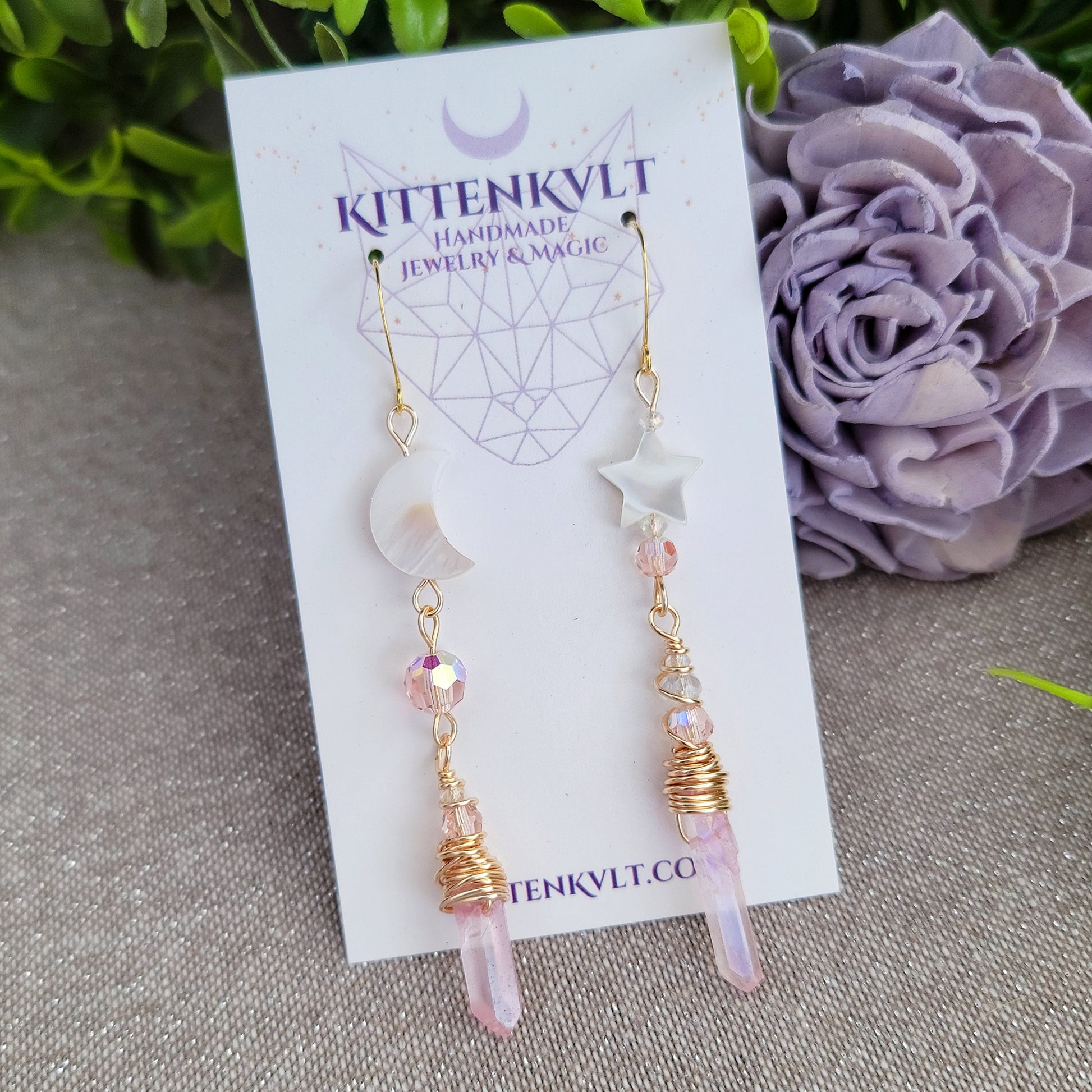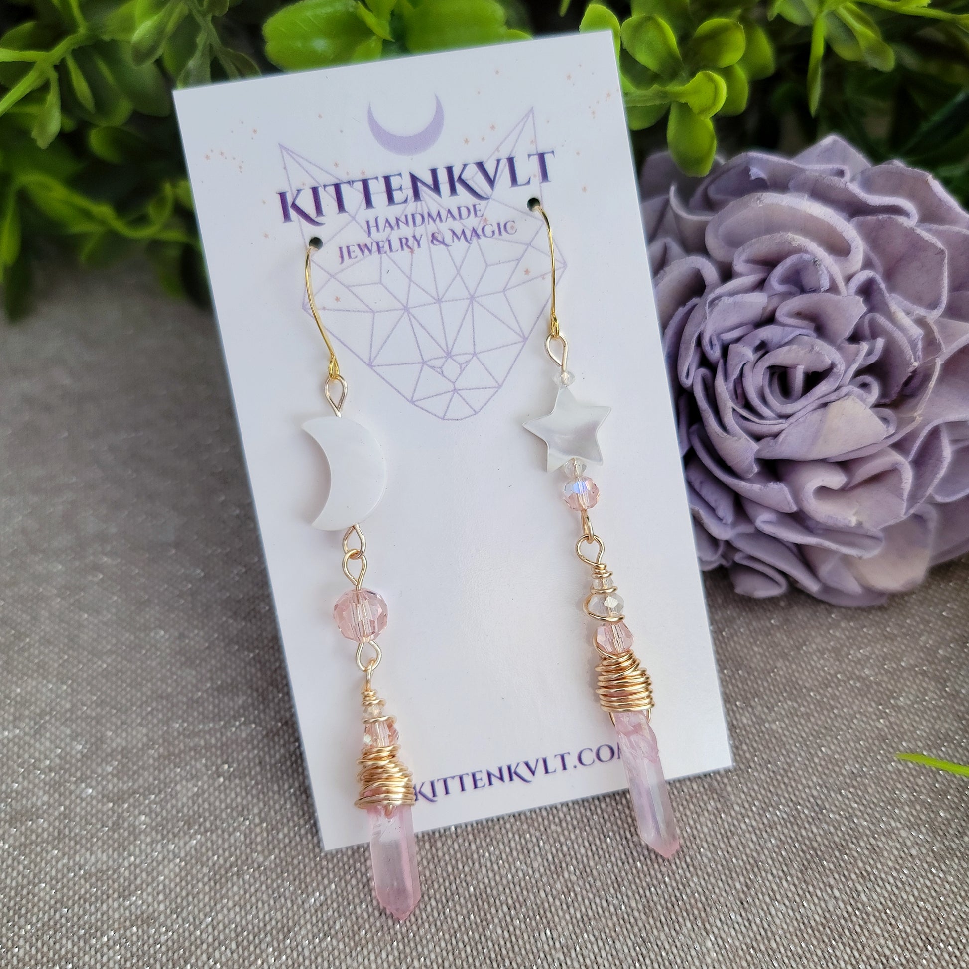 - pink aura quartz, mother of pearl shell & Czech Glass prism beads (pink aura quartz is clear quartz that has been dyed & heat treated to give the rainbow finish)